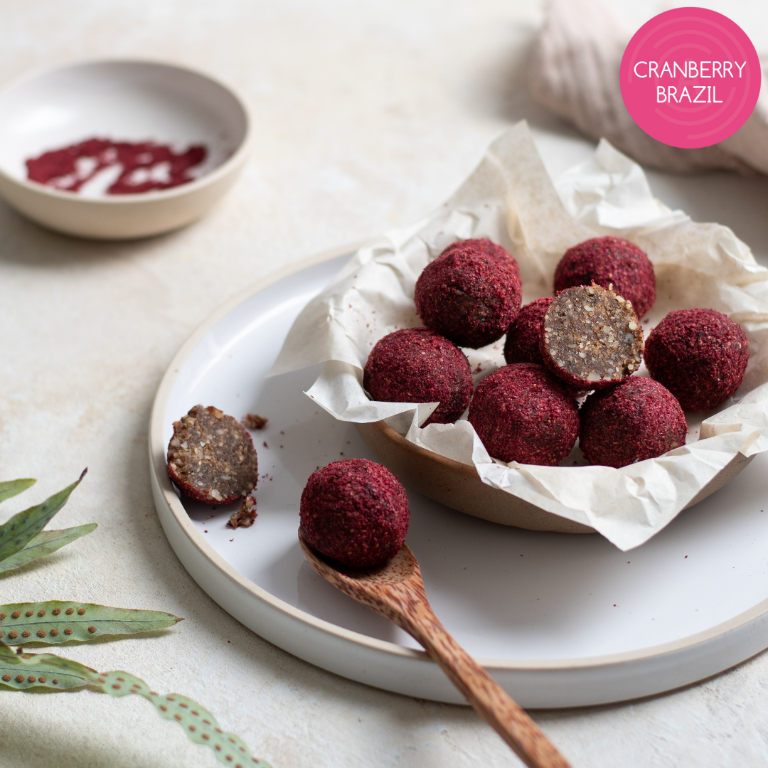 Contains nuts and seeds. Brazil nuts, almonds, dates, chia seeds, cinnamon, coated in cranberry.