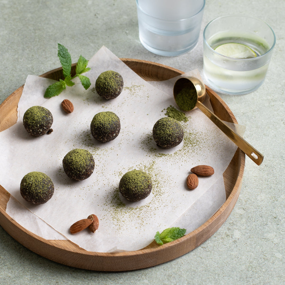 A bowl of chili cacao energy balls surrounded by a plate loaded with raw ingredients.